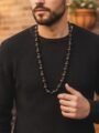 Unlike traditional knotted malas, this piece is individually wire-wrapped with durable copper findings, showcasing meticulous craftsmanship and adding a distinctive, rustic aesthetic. Copper is often associated with healing and energy conductivity. Wear it as a long layering necklace to add a touch of bohemian or spiritual flair to any outfit, or use it traditionally for counting mantra repetitions during Japa meditation. A truly unique piece that marries spiritual purpose with timeless style.